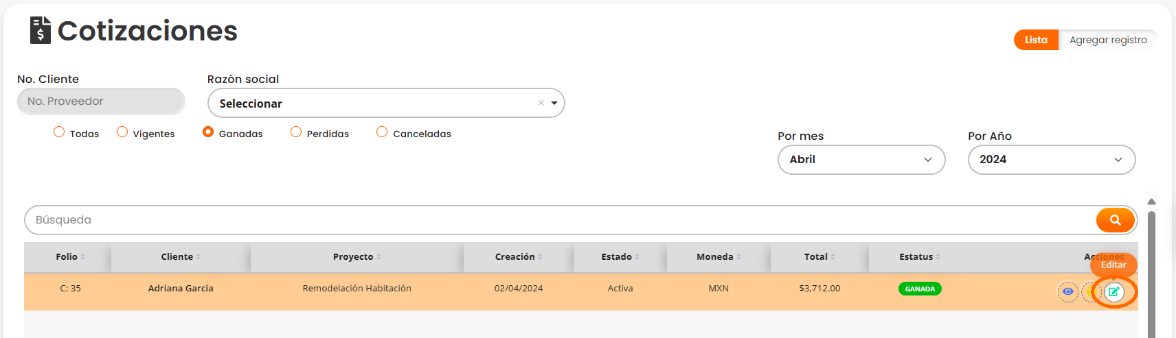 La opción de “Edición” te ofrece la capacidad de realizar cambios y ajustes en la cotización según sea necesario, antes de finalizar su creación o envío. Esto incluye la capacidad de actualizar la información existente, agregar nuevos productos o servicios, modificar cantidades, cambiar precios y realizar cualquier otra modificación necesaria para reflejar con precisión los requerimientos del cliente o las actualizaciones en el proyecto.