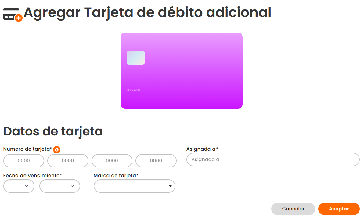 - “Número de tarjeta”: Ingresa el número único de la tarjeta de débito adicional que deseas agregar a la cuenta.