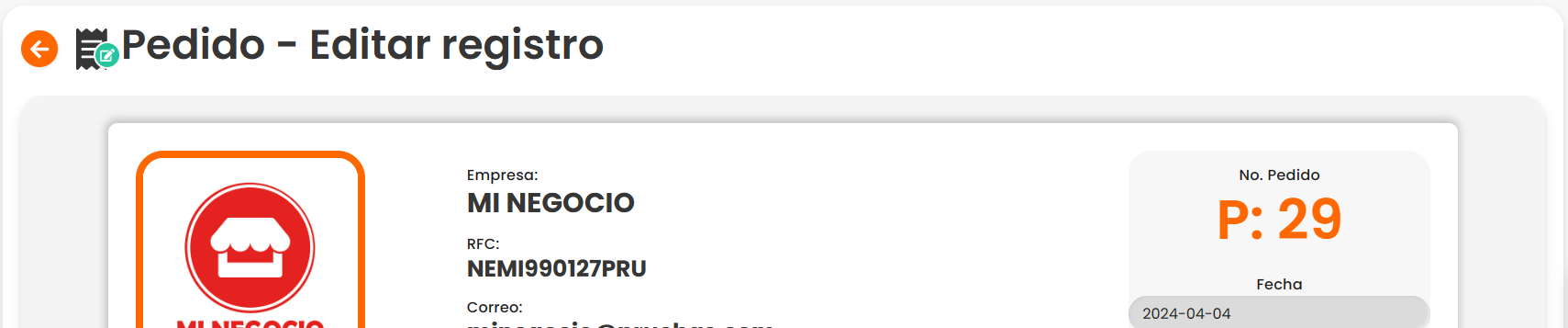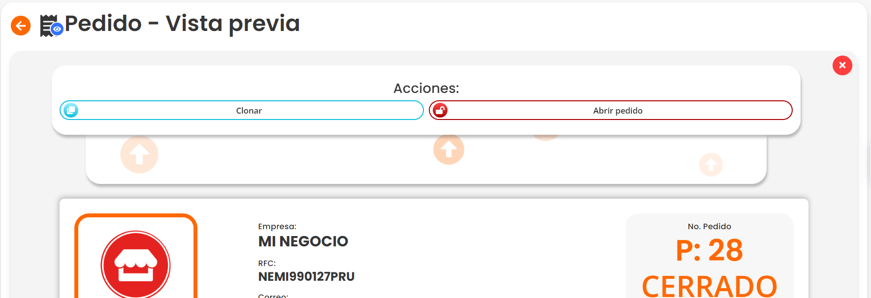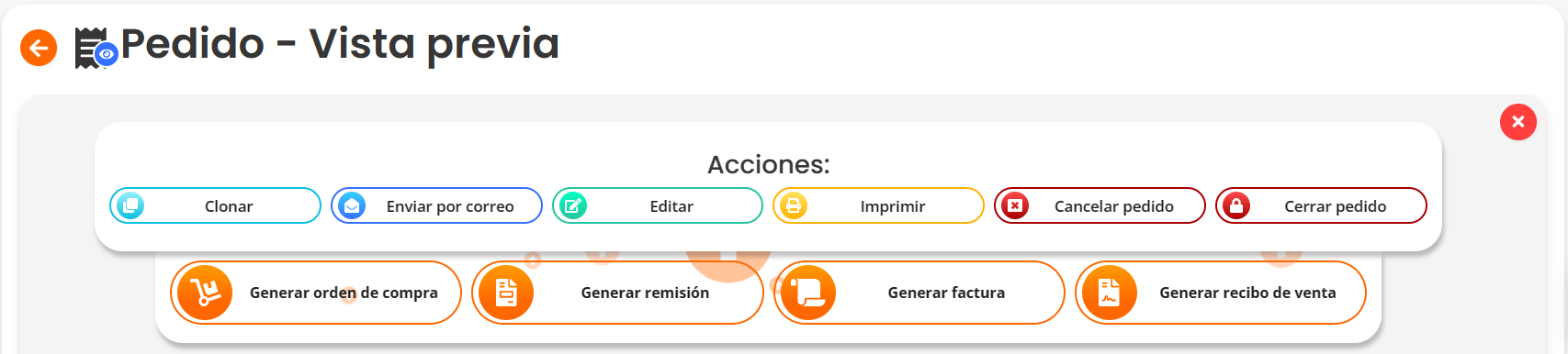 En la barra de “Acciones” ubicada en la “Vista previa” del pedido, al inicio encontraras una serie de botones que te permiten realizar diversas acciones relacionadas con el pedido. A continuación, explicaremos el funcionamiento de cada botón: “Clonar”, “Enviar por correo”, “Editar”, “Imprimir”, “Cancelar pedido”, “Cerrar pedido”, “Generar orden de compra”, “Generar remisión”, “Generar factura” y “Generar recibo de venta”. Estos botones te ofrecen herramientas útiles para gestionar y modificar el pedido según sea necesario.