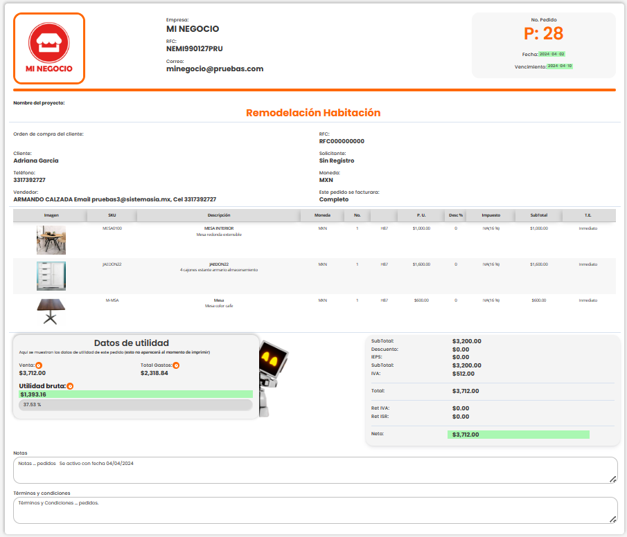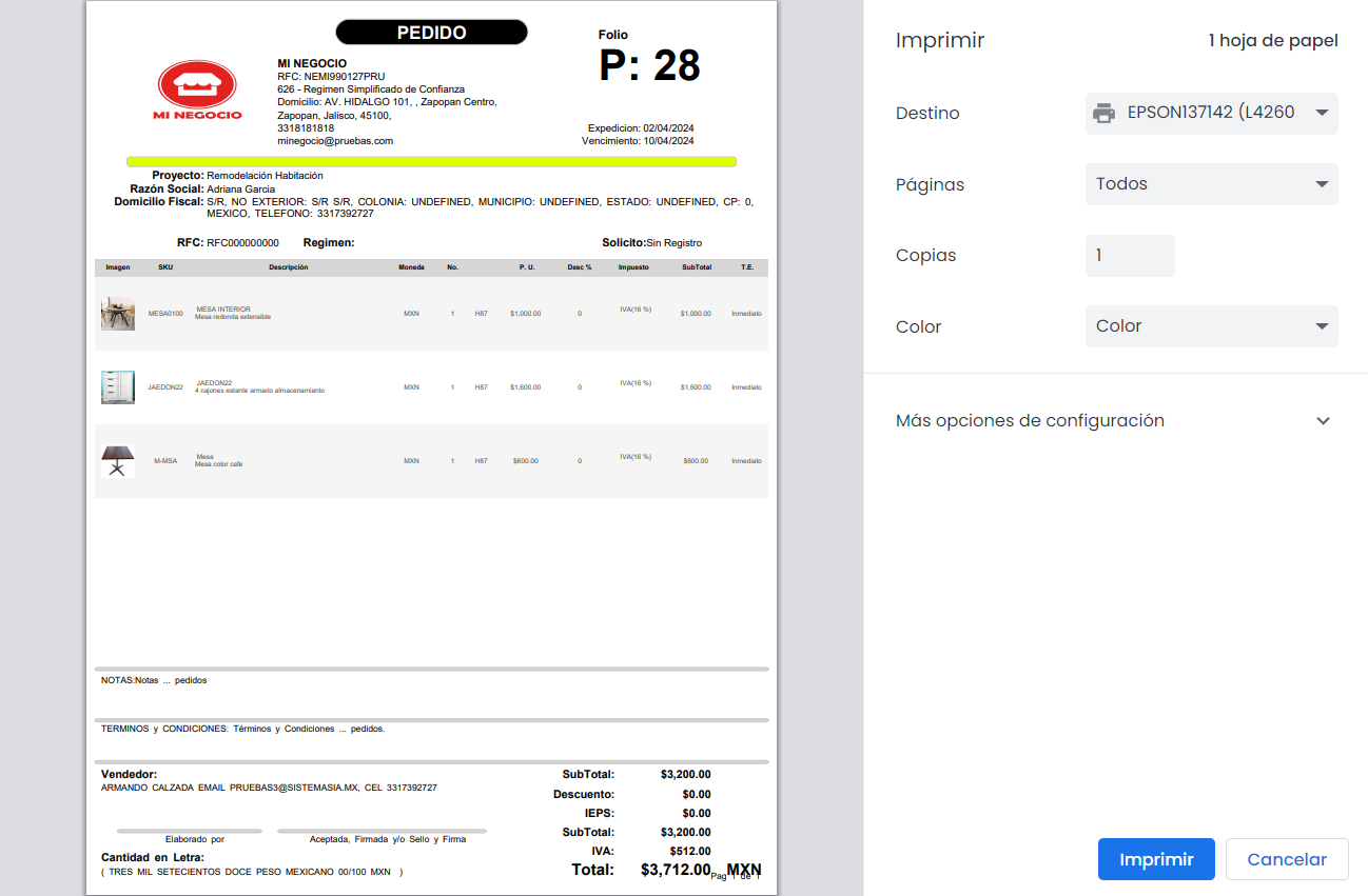 Vista previa completa de pedidos. En esta vista, encontraras todos los datos ingresados al generar el pedido: