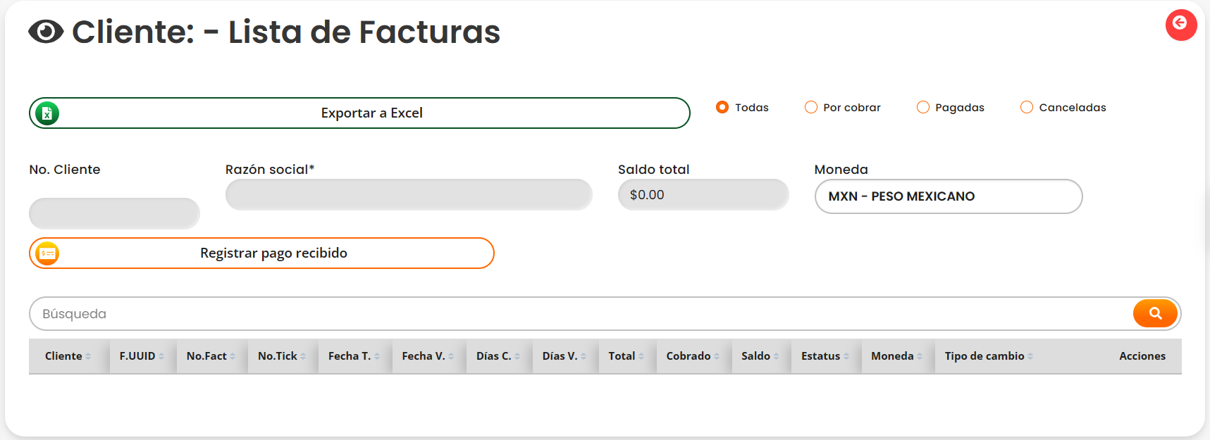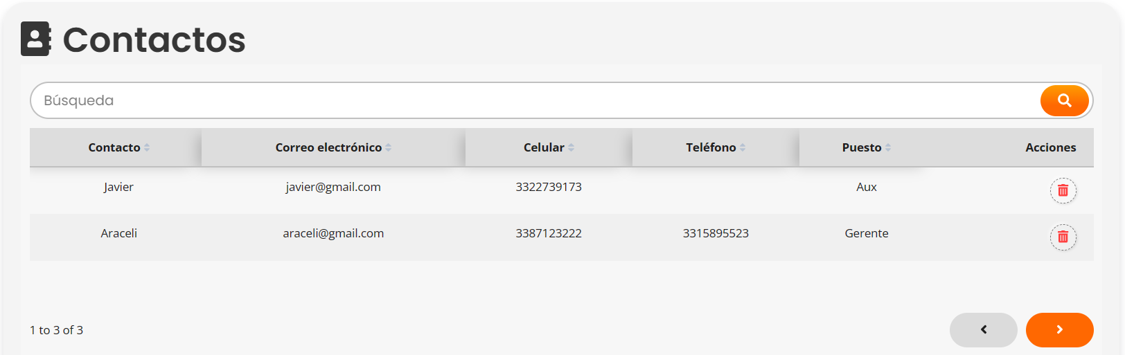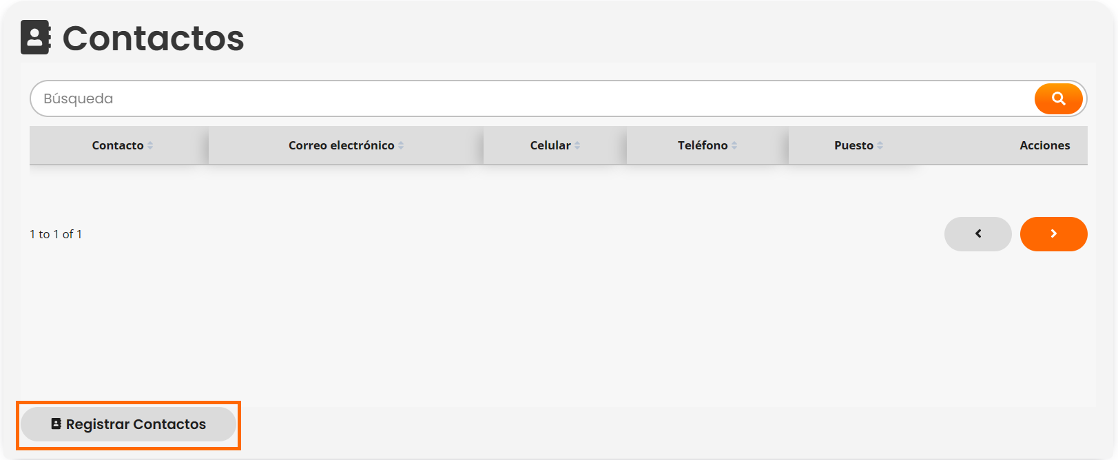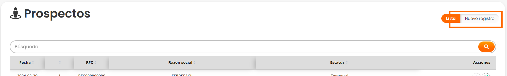 Al ingresar a prospectos se mostrará una lista con nuestros prospectos agregados anteriormente. Para registrar un nuevo prospecto hacer click en el botón "Nuevo registro".